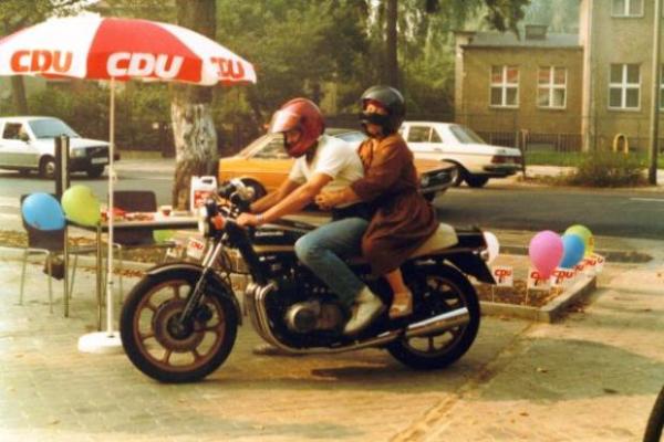 Renate als Sozius bei einer CDU-Rally.