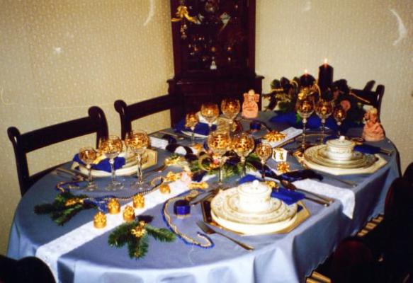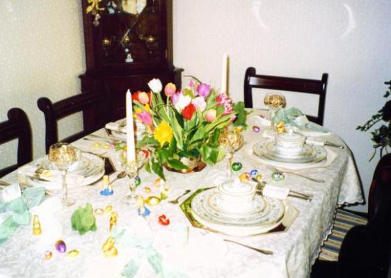 Ostertisch für vier Personen, drei Gängen: Suppe, Fleischgang, Dessert.