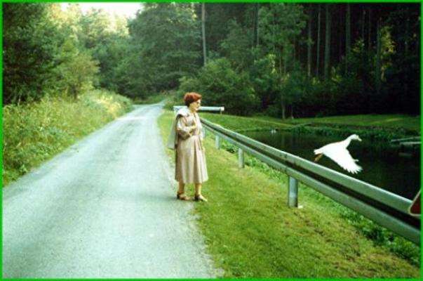Renate sitzt auf einer Bank am See.